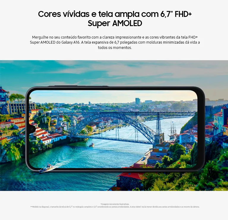 Com certificação IP54, até 6 atualizações de Android e Segurança e uma tela Super AMOLED FHD+ de 6.7”, o Galaxy A16 permite que você mergulhe no seu conteúdo favorito com cores vívidas e uma tela ampla.