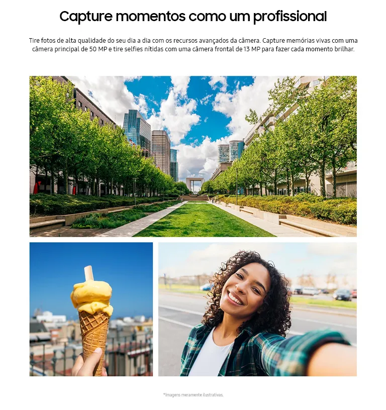 O smartphone ainda conta com Câmera Tripla de múltiplas possibilidades, sendo sua câmera principal de até 50MP com Ultra Wide e a Selfie de 13MP, permitindo a captura de memórias vivas e realistas.